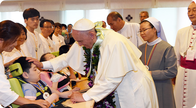2014년 한국을 방문하신 프란치스코 교황님께서는 꽃동네 장애인 시설인 희망의집에서 80여명의 꽃동네 가족들을 축복해 주셨고, 태아동산에서 낙태된 태아들과 낙태없는 세상을 위해 기도하셨다. 또한 한국의 4,300여명 수도자ㆍ성직자들과 만남을 가지셨고, 153명의 평신도 지도자들을 만나주셨다.