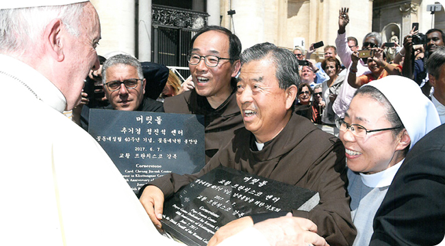 2017년 세계가톨릭성령쇄신 50주년을 기념하여 바티칸에서 개최된 세계성령대회에 참석한 오웅진 신부 일행은 강화꽃동네에 지어진 남북통일을 위한 기도의 집 <교황프란치스코센터>와 무연고자들을 위한 봉안당 <추기경정진석센터>의 머릿돌을 강복받았다.
