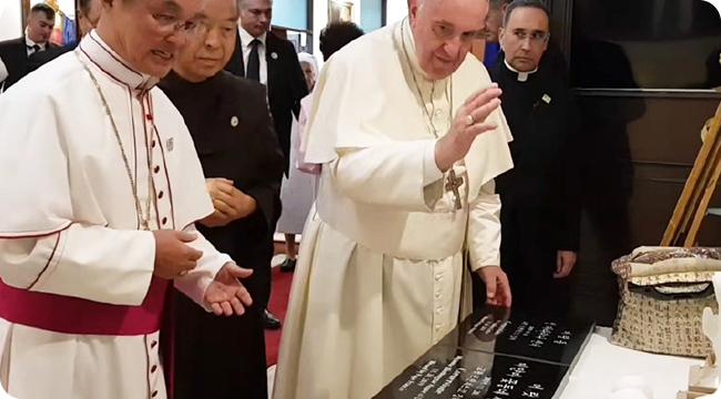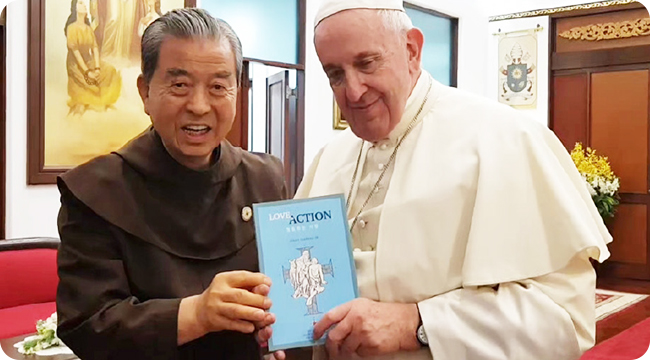 태국을 방문하신 프란치스코 교황님께 미얀마 꽃동네 머릿돌을 강복받았다. 교황님께서는 예수회 알베르 바노에 추기경이 집필한 꽃동네 <행동하는사랑(Love inAction)>책자를 들고 오웅진 신부와 기념 촬영을 하셨다.